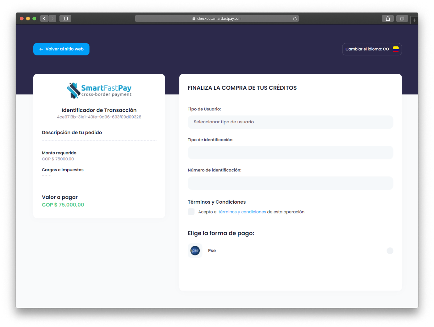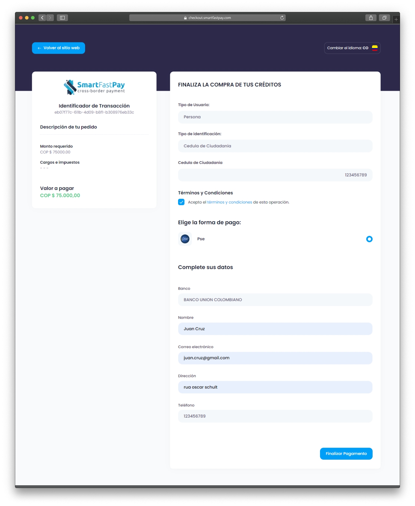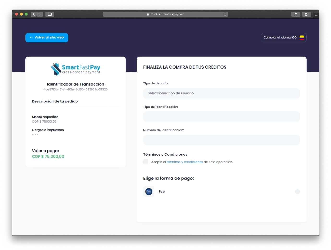 Use the Checkout API for a secure checkout via SmartFastPay. It auto-presents relevant payment types to shoppers, easing purchase with methods like Bank Transfer, PSE, and more.