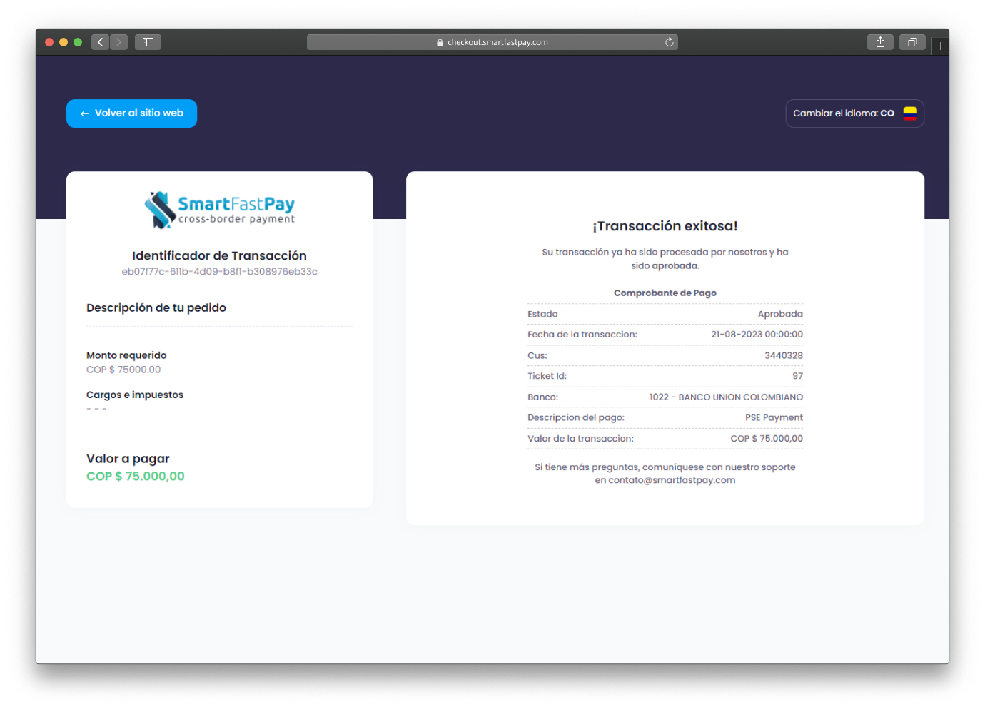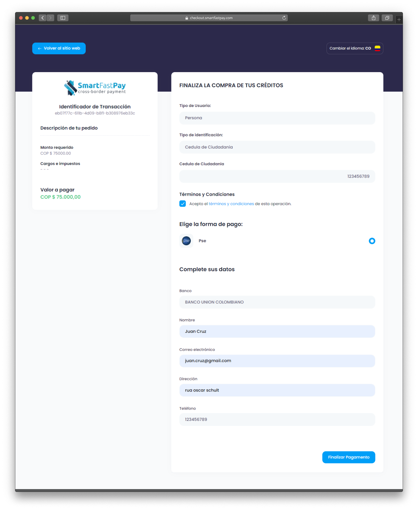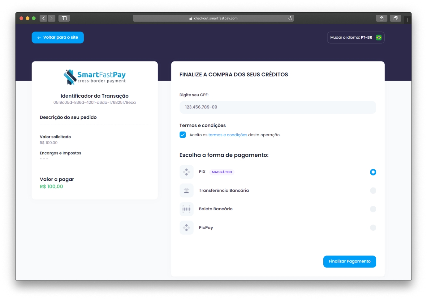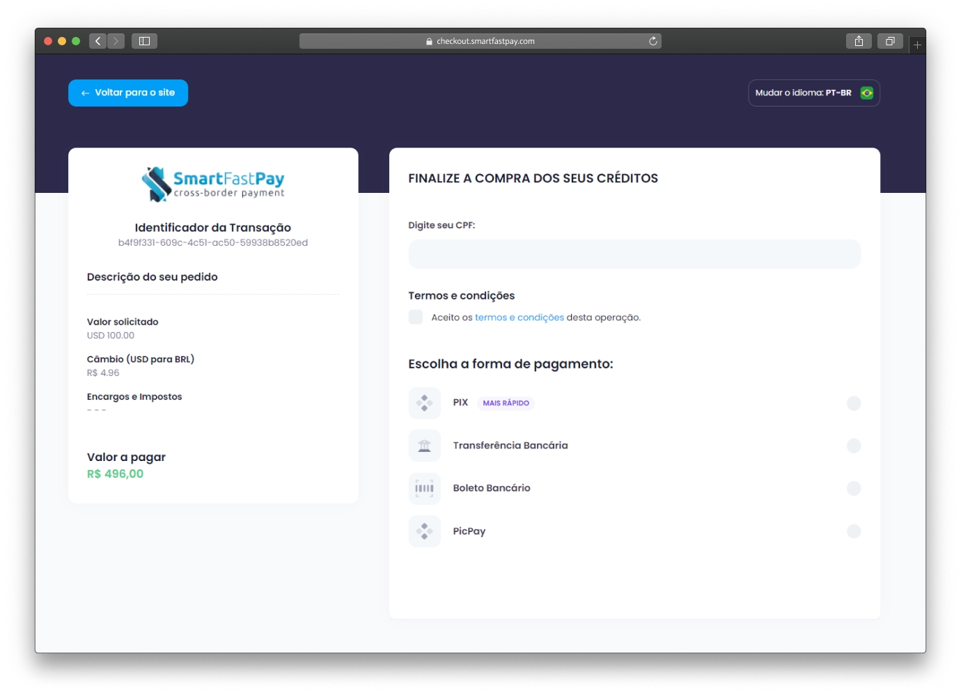 Use the Checkout API for a secure checkout via SmartFastPay. It auto-presents relevant payment types to shoppers, easing purchase with methods like Bank Transfer, PSE, and more.